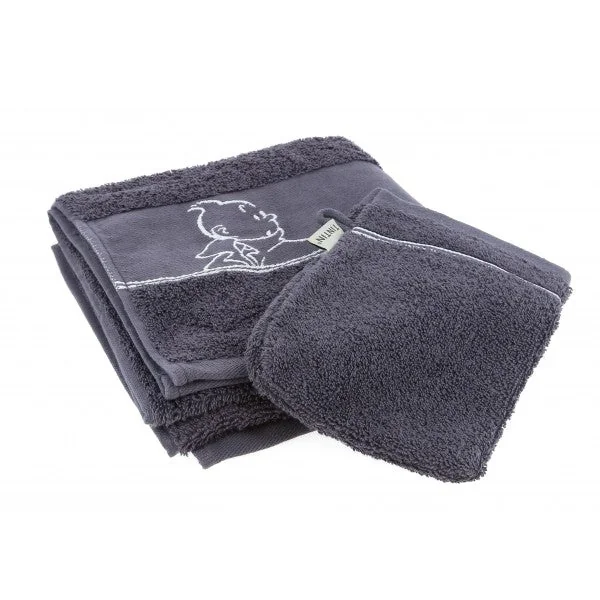 TINTIN: SERVIETTE DE BAIN ET GANT DE TOILETTE (GRIS)