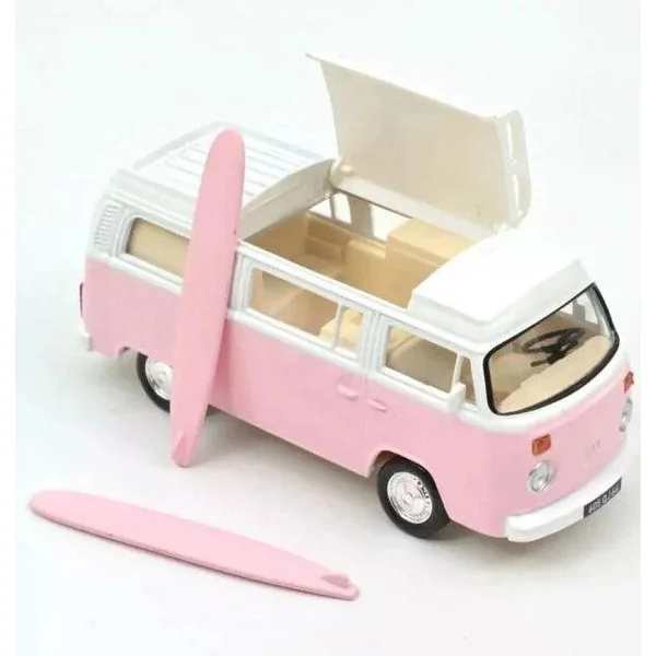 Le légendaire VW Combi T2B Camper Van 1973 revient dans une nouvelle édition 2025 au coloris rose pastel irrésistible ! Fabriqué en métal injecté avec une précision remarquable, ce modèle réduit 1/43 rend hommage au van emblématique de Volkswagen.Ses finitions soignées, ses roues fonctionnelles et son look vintage séduiront les collectionneurs de miniatures Jet-Car et les amateurs d’autos rétro.Elle est dotée d’un ouvrant et de deux planches de surf amovibles.Un must-have plein de charme, à exposer ou à offrir !