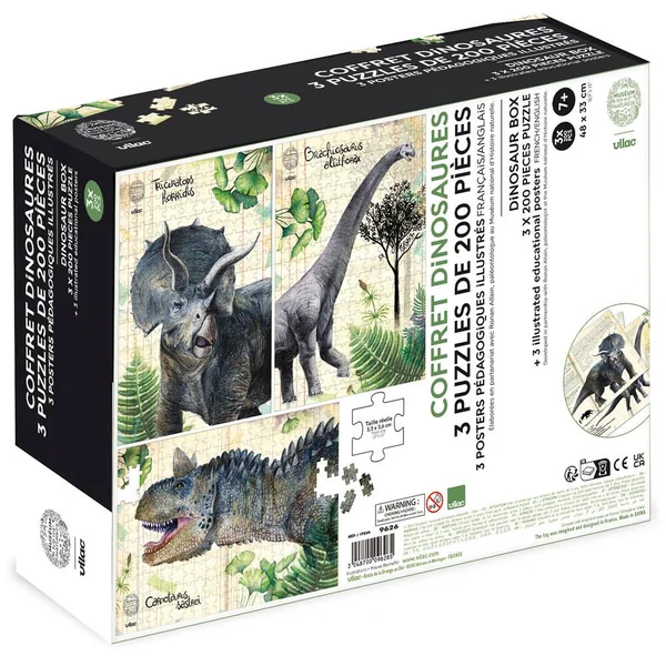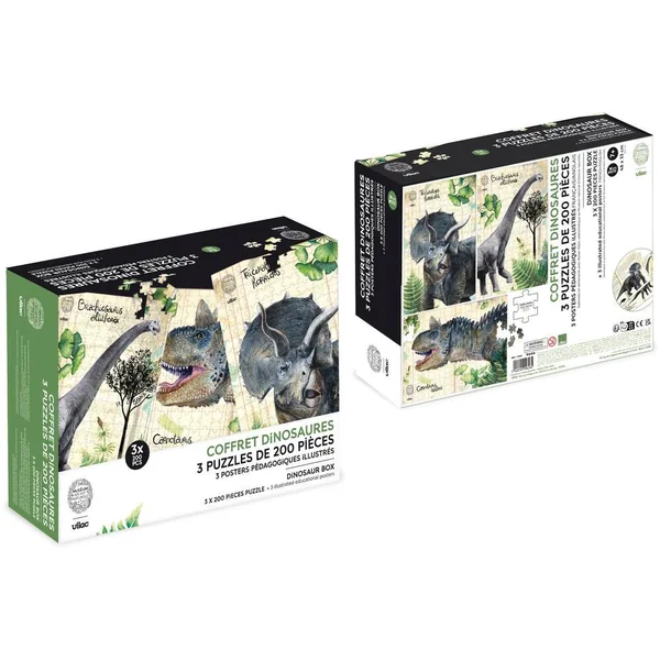 Coffret de 3 puzzles dinosaures avec posters – Muséum national d’Histoire naturelle – Ce coffret de 3 puzzles de 200 pièces chacun est une vraie fresque préhistorique avec ces impressionnants dinosaures dessinés par notre équipe créative dans le Jura en collaboration avec le paléontologue Ronan Allain. Grand spécialiste au sein du MNHN (Museum national d’Histoire naturelle), il a notamment découvert récemment en Provence le Pyroraptor Olympus, voleur de feu de l’Olympe. Nos trois puzzles sont accompagnés de fiches explicatives dans lesquelles vous découvrirez des détails et anecdotes uniques sur le Tricératops, le Carnautaurus et le Brachiosaure. Laissez les enfants découvrir et jouer avec ces créatures incroyables qui ont parcouru notre planète il y a des millions d’années. Une manière originale d’apprendre en s’amusant ! Le puzzle est parfait pour apprendre en s’amusant ! Relevez le défi de réaliser ce puzzle de 200 pièces et admirez le résultat ! Ce puzzle est conseillé pour les enfants dès l’âge de 5 ans.