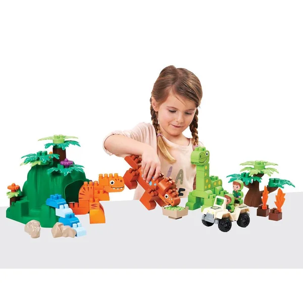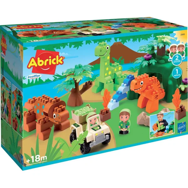 Ce jouet de construction Dino land Abrick comprend : Contient 3 dinosaures à construire en briques, 1 île, 1 véhicule tout-terrain et 2 personnages. 53 briques incluses.