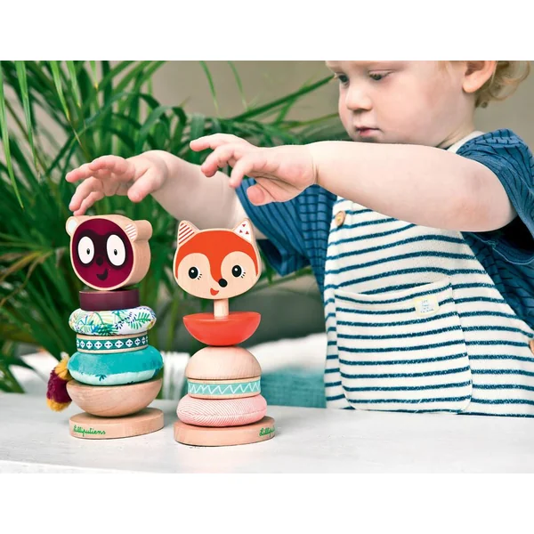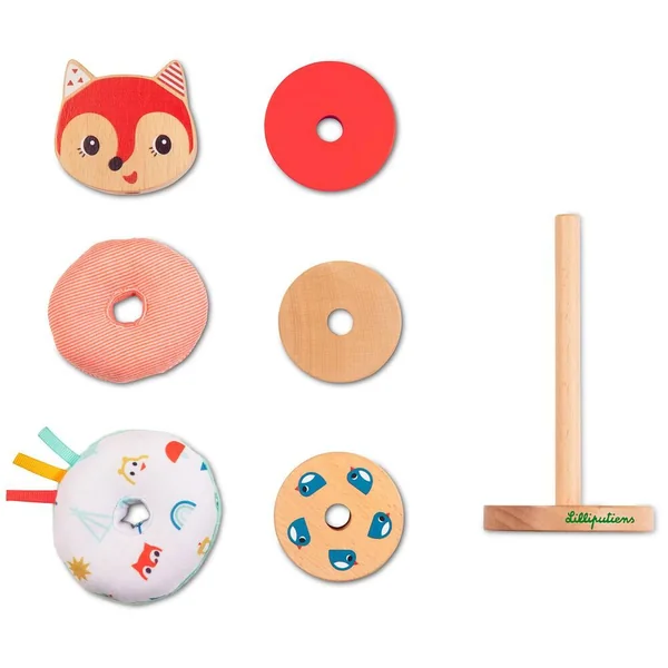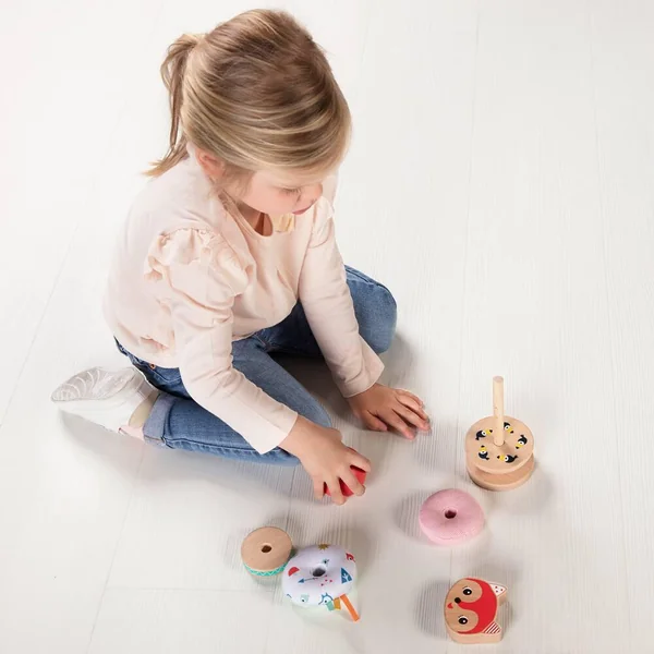 Jolie pyramide à empiler pour développer la motricité fine. Empilez les pièces de différents matériaux et de différentes couleurs de manière créative. La variété de formes, de couleur et de matériel stimulent les sens. Avec des éléments en bois et en tissu de formes et couleurs différentes (bois certifié et peinture à l’eau). Lavable en machine.