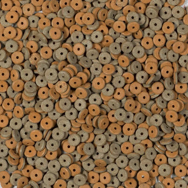 Ces multi-comprimés sont bicolores : le côté orange contient des caroténoïdes pour renforcer la coloration naturelle, tandis que le côté vert foncé contient des algues spiruline et chlorella, des ingrédients végétaux pour renforcer la vitalité et la longévité des poissons.