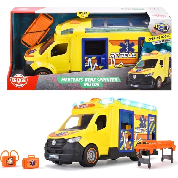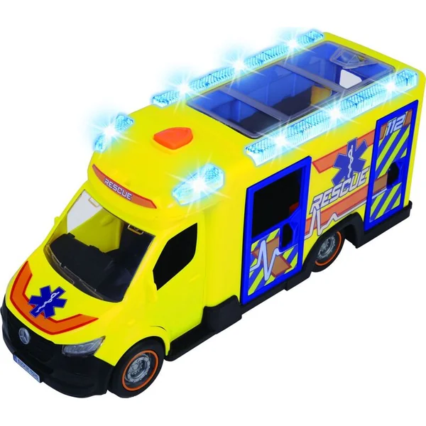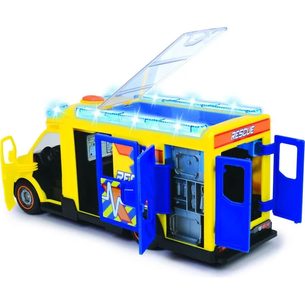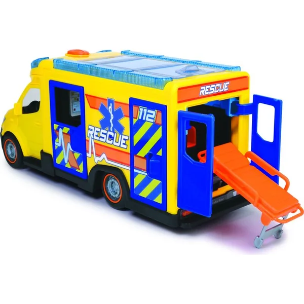 Ambulance au ralenti, effet lumineux et sonore, portes et toit ouvrants, intérieur, brancards et autres accessoires.