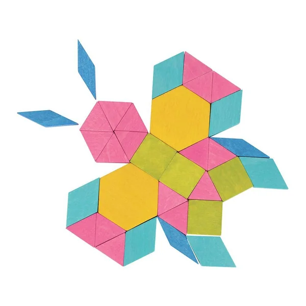 Baril contenant 250 pièces en bois. Avec 6 formes géométriques différentes : hexagone, 2 types de losange, carré, trapèze et triangle. Chacune des formes géométriques est associée à une couleur. Développement de la créativité et de la coordination main-œil. Pour aider l’enfant des modèles sont imprimés sur le baril. Pratique tout se range et se transporte dans le baril.