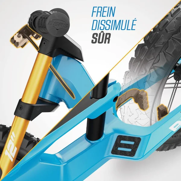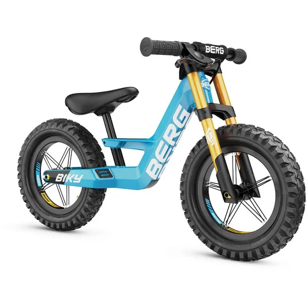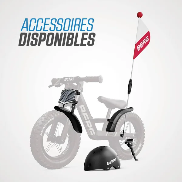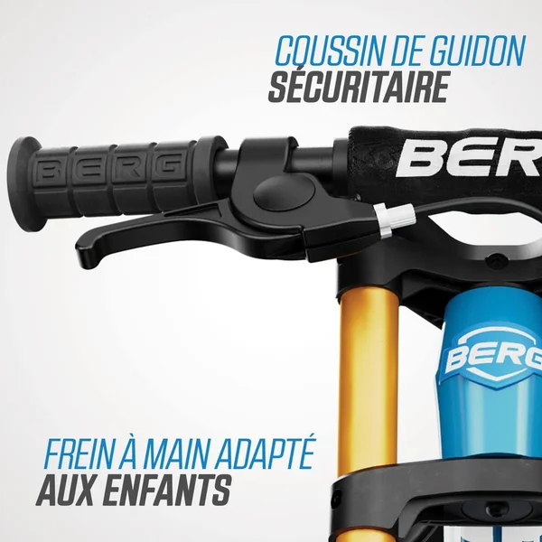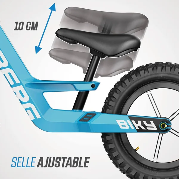 Le BERG Biky est un vélo d’équilibre pour les enfants de 2,5 à 5 ans. Vous avez une préférence plus classique ? Ou vous préférez vous attaquer à l’herbe et à la boue ? BERG vous propose le vélo d’équilibre idéal ! Choisissez parmi quatre versions : Cross, Retro, City et Mini. Le BERG Biky présente un aspect frappant et robuste grâce à son design distinct et à sa double fourche avant. Fabriqué en magnésium léger, le vélo est équipé d’un limiteur d’angle de braquage, d’une selle réglable et de pneus confortables. Points forts du vélo d’équilibre – Plus de 35 ans d’expérience dans le développement de jeux de plein air – Utilisation de matériaux de haute qualité et adaptés aux enfants – Convient à un usage intérieur et extérieur. Le pouvoir de la légèreté – À l’aide des dernières techniques de production et du magnésium léger, BERG a pu développer un cadre exceptionnellement robuste avec un poids très faible. Ceci rend le vélo d’équilibre facile à manier, mais surtout très agréable à conduire. L’importance d’une ergonomie optimale – Avec son cou-de-pied bas et sa selle réglable en hauteur, il est facile de monter sur le Biky, adapté aux enfants de 85 cm à 115 cm. Le serrage de la selle est intégré à la structure et peut être facilement actionné à l’aide de la clé Allen incluse dans la livraison. La hauteur de la selle du Biky 10″ (Biky Mini) commence à 29,5 cm, et à 32 cm pour les Bikys 12″ (City, Cross et Retro). Les repose-pieds intégrés avec bande antidérapante permettent un équilibre sans effort ! Direction et freinage contrôlés – Préparez vous à faire du vélo en toute autonomie avec le vélo d’équilibre Biky ! Se tenir en équilibre sur deux roues tout en apprenant à se diriger est un véritable défi pour un très jeune enfant. Afin d’éviter que le guidon ne sur-vire soudainement, nous avons équipé le Biky de BERG d’un limiteur d’angle de braquage qui peut être ajusté à un réglage pour débutants, ou à un réglage pour cyclistes avancés. Les Biky City blue, Cross blue et Cross grey sont également disponibles dans des versions avec frein à main pour encore plus de sécurité. Avec les accessoires du Biky de BERG, conduire votre vélo d’équilibre n’est pas seulement plus amusant, mais aussi plus sûr ! Ainsi, vous pouvez protéger cette jolie tête avec un casque branché, et un drapeau permet d’être vu par les automobilistes. Un support de vélo permet de garer le Biky n’importe où. Et pour les cyclistes les plus endurcis, nous avons également prévu un support de guidon. Grâce à sa bandoulière ultra pratique, maman et papa peuvent facilement emmener le vélo avec eux lors d’une promenade au parc ou en ville. Pour enfant de 90 cm à 120 cm. Siège réglable, rotation sécurisée du guidon, pneumatiques 12″, limiteur d’angle de braquage et cadre robuste. Poids maxi. de l’utilisateur : 30 kg.
