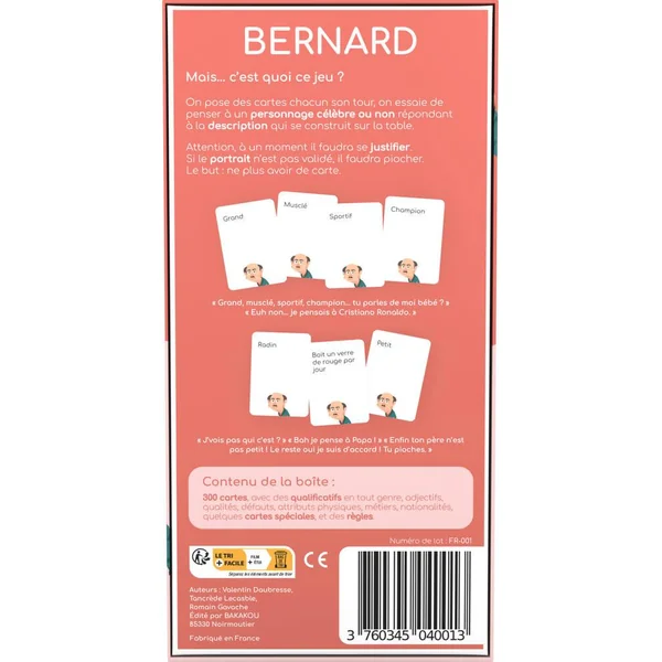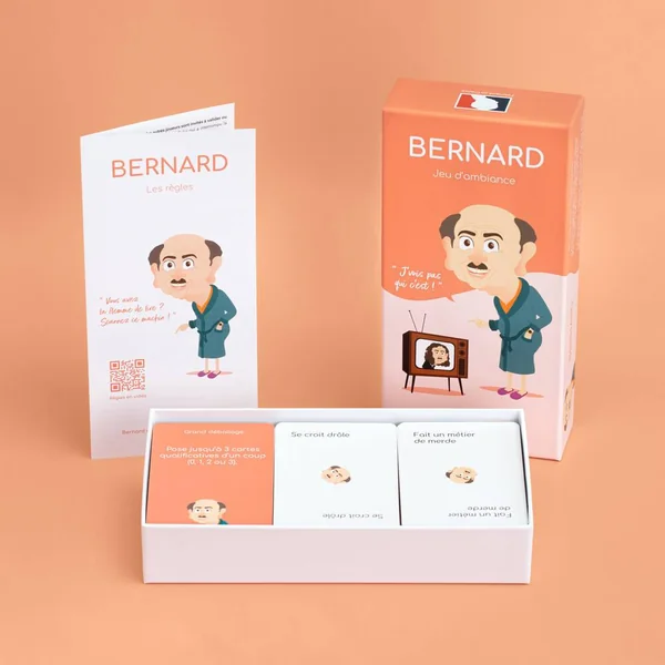 Bernard est un jeu d’ambiance original créé dans l’unique but de vous faire rire et vous faire passer de bons moments. Pour remporter la victoire, vous devez faire preuve d’humour et de persuasion.