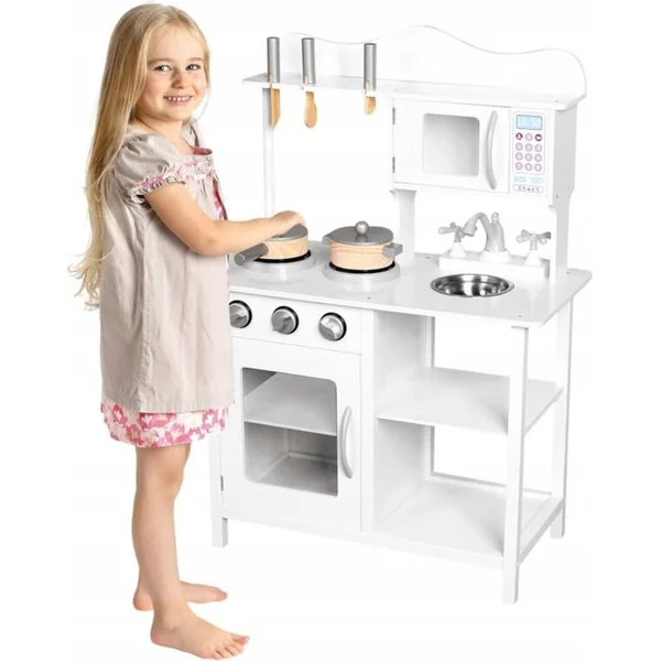 Cuisine en bois compacte est le jouet idéal pour les petits chefs et cuisinières qui aiment préparer de délicieuses friandises dans leur propre cuisine. Elle est équipée d’un évier, d’une cuisinière, d’un four et d’un micro-ondes, offrant ainsi tout ce qu’il faut pour un jeu réaliste. Sous l’évier, il y a deux étagères pratiques pour ranger la vaisselle et les accessoires. La cuisine est stable, robuste et fabriquée principalement en bois massif et en contreplaqué, garantissant une longue durée de vie même avec un usage quotidien.