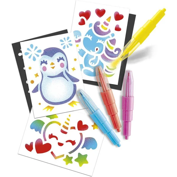 Crée des dessins supers mignons à effet aérographe grâce à tes 10 pochoirs ! Pochoirs réutilisables. Bouchons lavables. Dès 4 ans