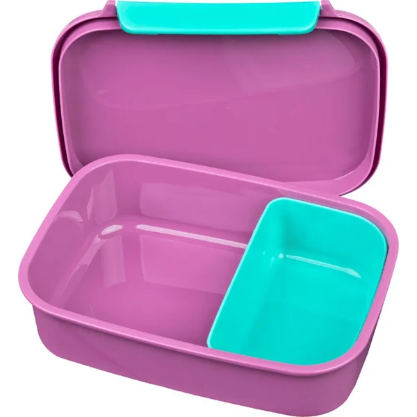 Boîte en plastique pour le déjeuner, avec un séparateur à l’intérieur.