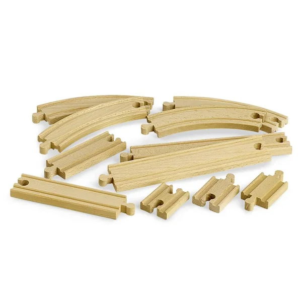 Un pack de rails en bois de hêtre de 11 éléments pour étendre son circuit ! Contient 4 rails courbes 170 mm, 2 rails droits 216 mm, 1 rail droit 144 mm, 1 rail droit 108 mm, 1 rail droit 54 mm, 1 rail droit 54 mm mâle/mâle, 1 rail droit 54 mm femelle/femelle.