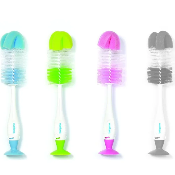 La brosse de nettoyage pour bouteilles et tétines 2 en 1 avec ventouse de la marque BabyOno est conçue pour un nettoyage facile des bouteilles et tétines pour enfants.