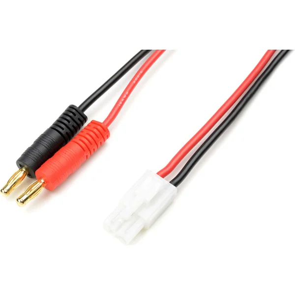 Câble de chargement avec connecteur Mini Tamiya appareil (femelle) et bananes dorées de 4 mm, câble de 16 AWG d’une longueur de 30 cm.