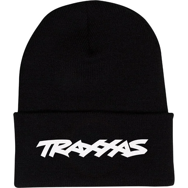Bonnet pratique de qualité en noir avec le logo blanc Traxxas pour les pilotes de course, matériau 100% acrylique hypoallergénique.