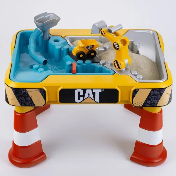 CAT TABLE DE JEU A SABLE ET EAU Table de jeu à sable et à eau. Montée sur 4 pieds façon cônes de chantier. Elle comporte : – 2 bassins amovibles – 1 pont reliant les bassins – 1 cloison de séparation – 2 tuyaux – 1 bouchon de tuyaux – 1 pelle articulée – 1 bac à sable et/ou à eau surélevé Livrée avec 1 camion benne CAT (env. 11 x 6 cm). Dimensions du produit monté : 67 x 48 x 40 cm.