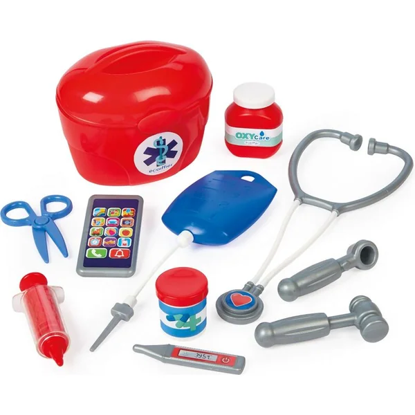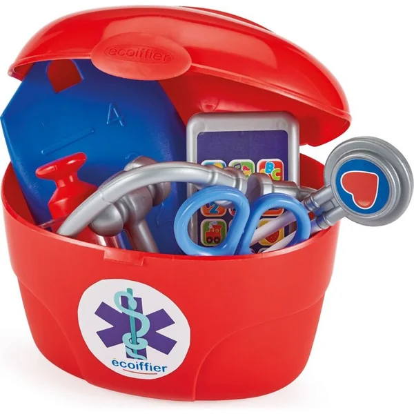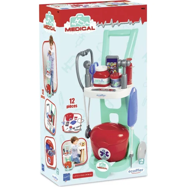 Le chariot pour les petits médecins comprend une mallette médicale, un stéthoscope, une perfusion et d’autres accessoires – une seringue, un thermomètre, des ciseaux, etc. pour évaluer l’état de santé du patient.