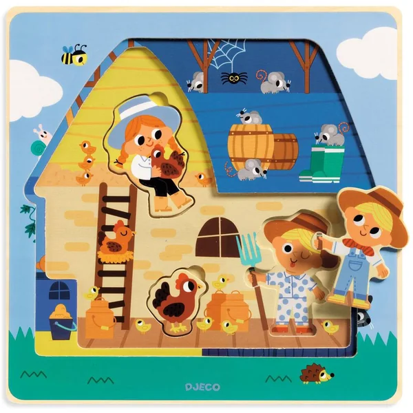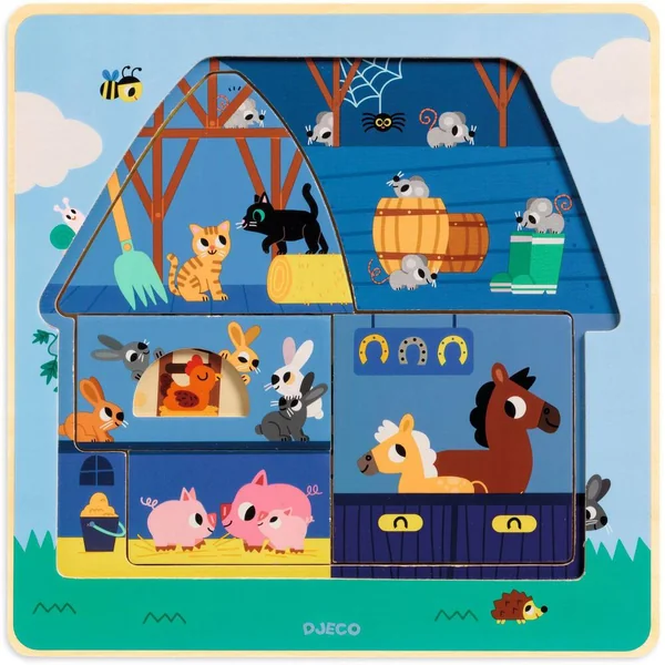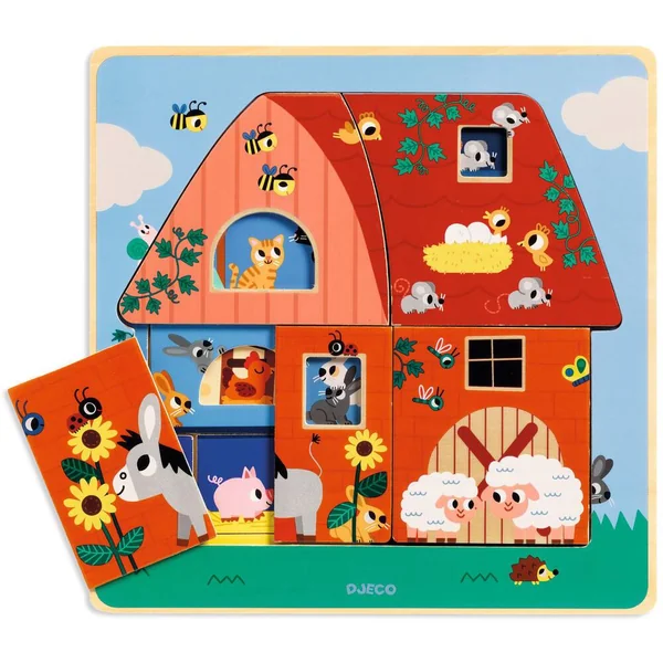 Le puzzle 3 niveaux Chez Moo est un puzzle en bois de 12 pièces. Chaque niveau comporte un puzzle de plusieurs pièces à assembler. Au fur et à mesure que l’enfant place les pièces, il découvre la vie des animaux dans la grange.