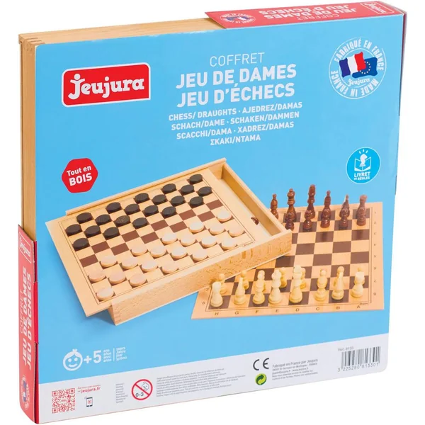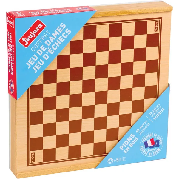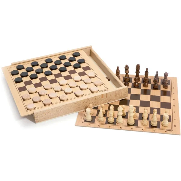 Jeux de Dames et d’Echecs : coffret en bois avec couvercle sérigraphié réversible. Pions de dames et pièces d’échecs en bois. Dimensions du coffret : 30 x 30 x 4,5 cm .