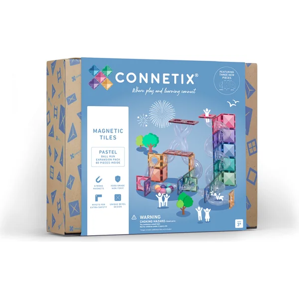Préparez-vous à un divertissement éblouissant, rapide et tournoyant grâce à un jeu et un apprentissage illimités ! Le pack d’extension CONNETIX de 80 pièces de la piste à billes Pastel comprend des pièces magnétiques carrées, des billes en bois et une série de tubes transparents et rainurés qui vous permettent d’explorer le mouvement et la gravité comme jamais auparavant. Avec des tubes en forme de X pour rediriger et faire tourner l’action, des bols d’entrée doubles pour de nouvelles façons de jouer ensemble et de faire la course, des pièces en spirale pour un plaisir visuel, ainsi que des pièces de 1/2 et 1/4 pour les virages et les rotations, vous concevrez et construirez vos propres pistes encore et encore.