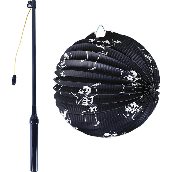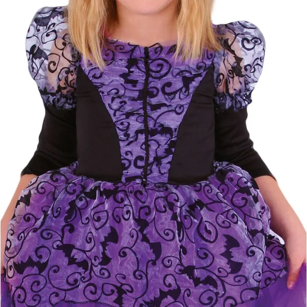 - La robe violette avec une jupe bouffante et des manches trois-quarts est ornée d’un motif de chauve-souris noir.