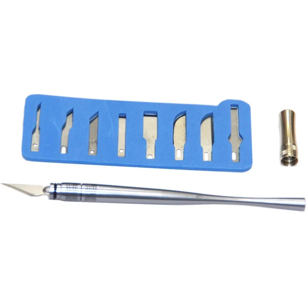 Couteau de modélisme professionnel avec neuf lames de différentes formes, long manche et capuchon de sécurité en aluminium.
