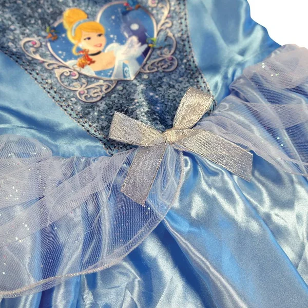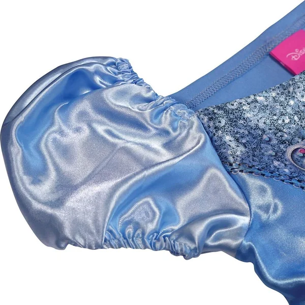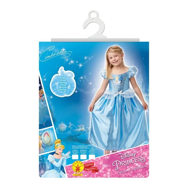 Déguisement classique sequin Cendrillon. Taille L. 7-8 ans. Comprenant : une robe bleue en tissu effet satin avec imprimé imitation sequins, un nœud à la taille. Les manches sont bouffantes.