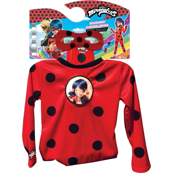 Une combinaison à manches longues en tissu jersey rouge à pois noirs. Un masque/loup assortie avec attache élastique. Une paire de gants en jersey avec logo Ladybug imprimé..