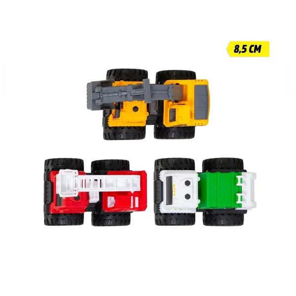 The Dickie Toys Mighty Engines Monster Truck assortment features three beloved everyday heroes: a fire truck, a garbage truck, and a construction digger, all transformed into powerful monster trucks with oversized tires. Each vehicle measures 8.5 cm and comes in a striking color design, complete with rubber wheels that enhance playability. Children will be thrilled to discover the unique play functions of each model, such as the fire truck’s foldable ladder with a rotating basket, the garbage truck’s swiveling container with an opening rear flap, and the construction vehicle’s movable digger arm with a shovel.