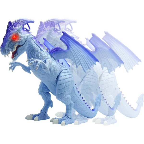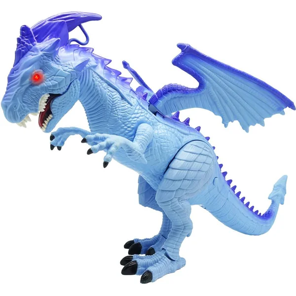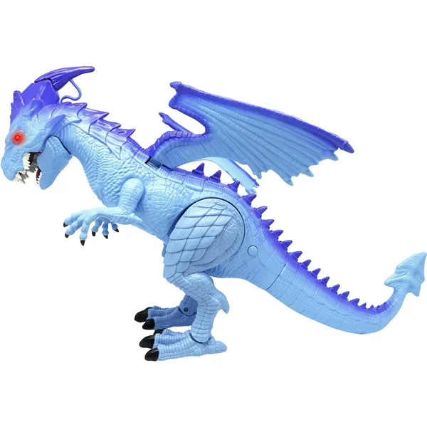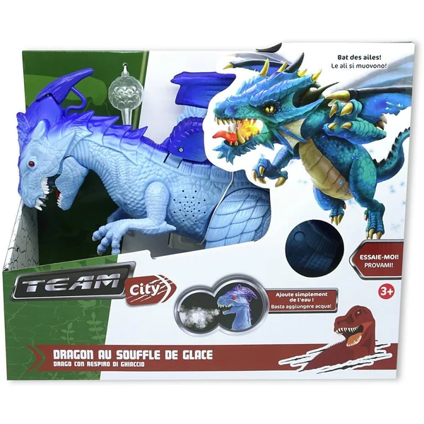 Dragon bleu qui marche réellement et au souffle ‘glacé’. Avec effets sonores et lumineux. Ajoute simplement de l’eau pour produire un souffle de glace ! Utilise la pipette fournie pour ajouter un peu d’eau dans la tête du dragon et voir ensuite l’effet souffle de glace ! Le dragon rugit et ses yeux s’allument ! Active le dragon et observe-le marcher et souffler de la glace ! Démarche féroce ! Bat des ailes ! 3 piles LR6 fournies. Fonction Try Me. En plastique. Notice incluse.