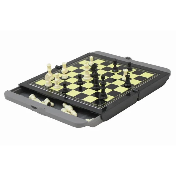 Jeu d’échecs magnétiques en plastique, compact et pratique. Idéal pour transporter en voyage ! Les pièces se rangent dans les tiroirs et l’échiquier se plie ! Les pièces et le plateaux sont magnétiques, et le plateau est lettré et chiffré. Dimension du plateau déplié: 17,5 x 20,5 cm. Cases 12 mm, hauteur du roi 31 mm.