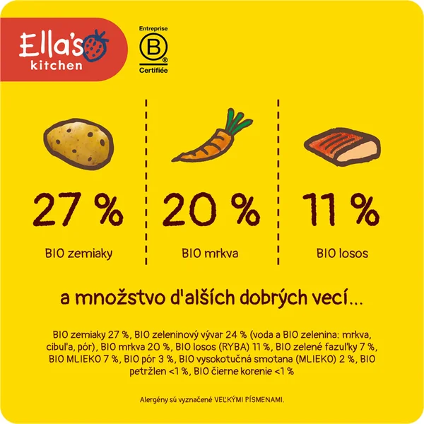 Ingrédients : bouillon de légumes BIO 24% (eau, carotte, oignon, poireau), pommes de terre BIO 27%, carotte BIO 20%, saumon BIO (POISSON) 11%, haricots verts BIO 7%, LAIT BIO 7%, poireau BIO 3%, oignon BIO 5%, crème (LAIT) BIO 2%, persil BIO < 1%, poivre noir < 1%. Les allergènes sont indiqués EN MAJUSCULES.