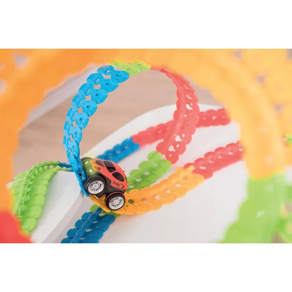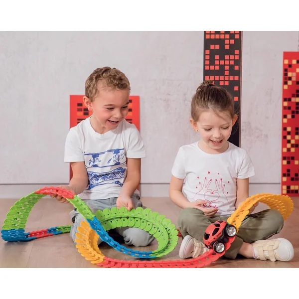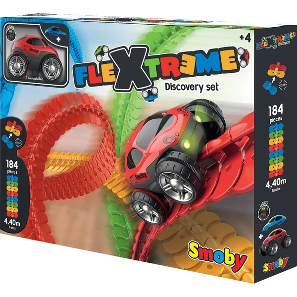 184 pièces flexibles pour créer une multitude de circuits ! Longueur de piste : 4,4 mètres. Avec 1 véhicule (à roues libres), 1 carrosserie et 1 pièce entré/sortie.