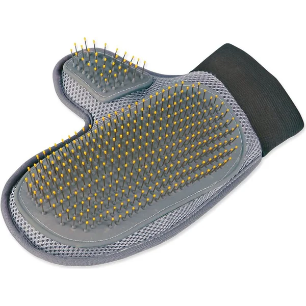 - Le gant est équipé de poils en fil métallique avec des billes à l’extrémité, qui massent la peau de l’animal lors du brossage. Ce massage aide à stimuler la circulation sanguine, ce qui peut contribuer à une meilleure santé du pelage et de la peau.