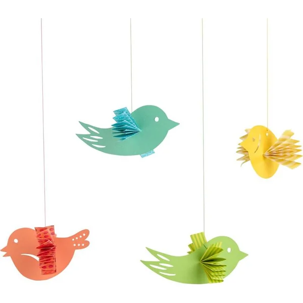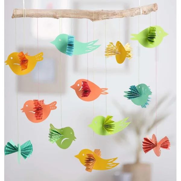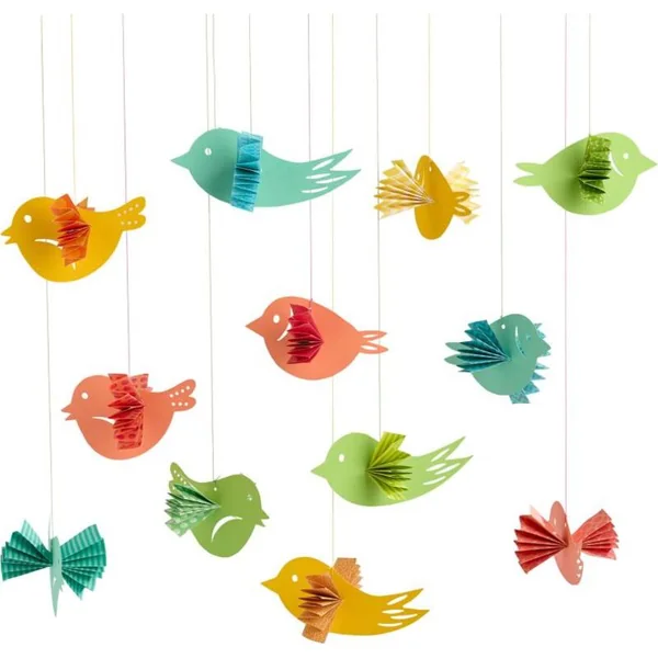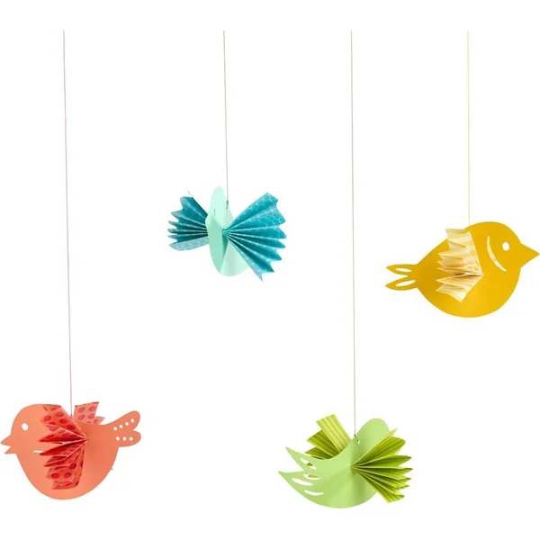 Il suffit de retirer les oiseaux du carton photographique prédécoupé, puis de plier les feuilles de papier coloré le long des lignes. Les ailes se forment instantanément et se glissent facilement à travers le ventre de l’oiseau, puis s’étendent comme un éventail. Une décoration pour chaque pièce !