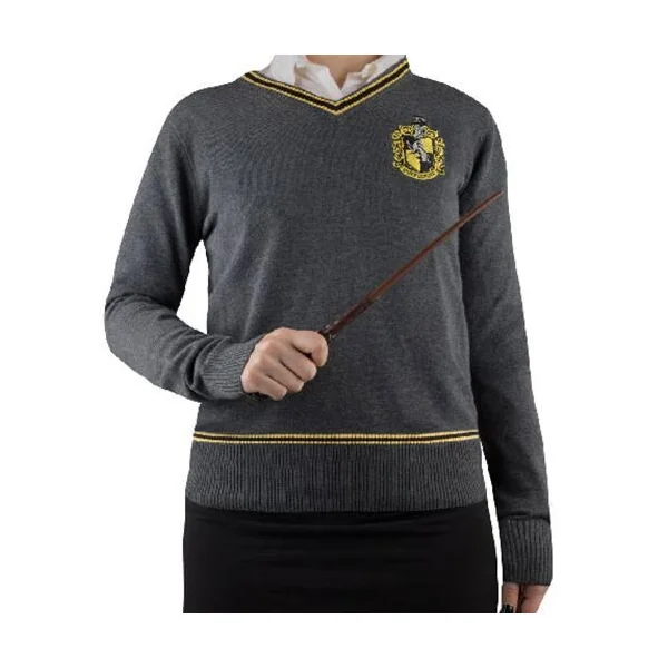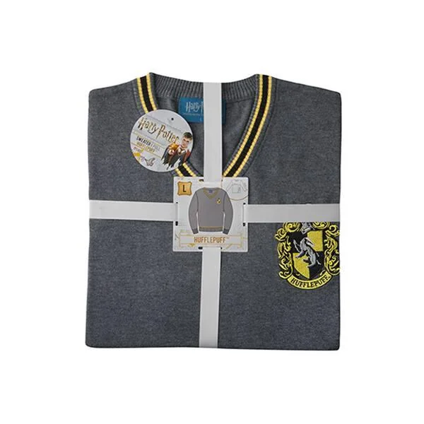 Tricot doux au toucher. Finition col en V. 60% Polyester + 40% Coton. Ecusson Poufsouffle brodé sur le devant.
