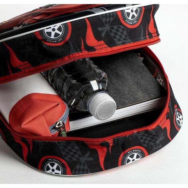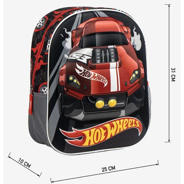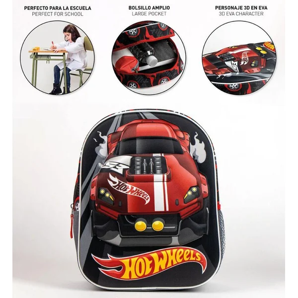 Sac à dos avec véhicule Hot Wheels en 3D EVA devant. Sac à dos zippé avec bretelles rembourrées. Grande poche. Parfait pour l’école. Matières : extérieur 100% polyester, intérieur 67% polyuréthane et 33% acétate de vinyle-éthylène. Lavage en surface uniquement avec un chiffon humide. Ce produit n’est pas un jouet. Age recommandé : de 3 à 6 ans.