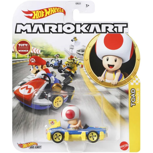 Mini-véhicule Hot Wheels à l’échelle 1:64 inspiré de Mario Kart pour des courses et cascades endiablées ! Retrouvez le plaisir du jeu caractéristique des produits Hot Wheels, reproduisez les cascades incroyables du jeu vidéo, évitez les dangers, déverrouillez des fonctionnalités, faites la course et revivez de grandes aventures. Tous les véhicules représentant un joueur de Mario Kart peuvent être utilisés sur les pistes Hot Wheels.