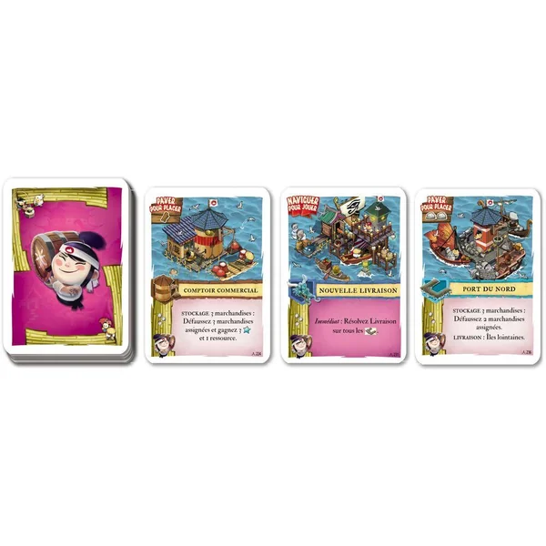 2×33 cartes Clan, 14 cartes Île, 4 jetons Navire et 1 livret de règles.