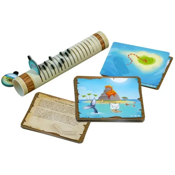 Passez-vous ensuite tour à tour la longue-vue pour décrire ce que vous y voyez, mais attention aux attaques des pirates ! Parmi toutes ces îles une seule cache le butin. 1 longue-vue, 20 tuiles Lentille, 30 cartes au trésor recto-verso, 15 cartes Histoires recto-verso, 1 plateau de jeu, 1 canon, 1 dé, 1 bateau en bois, 3 voiles en carton, la règle du jeu.