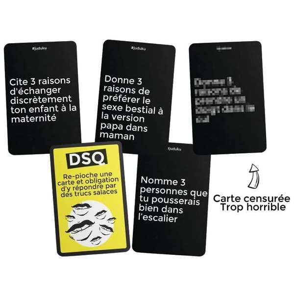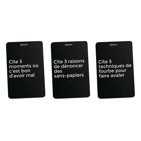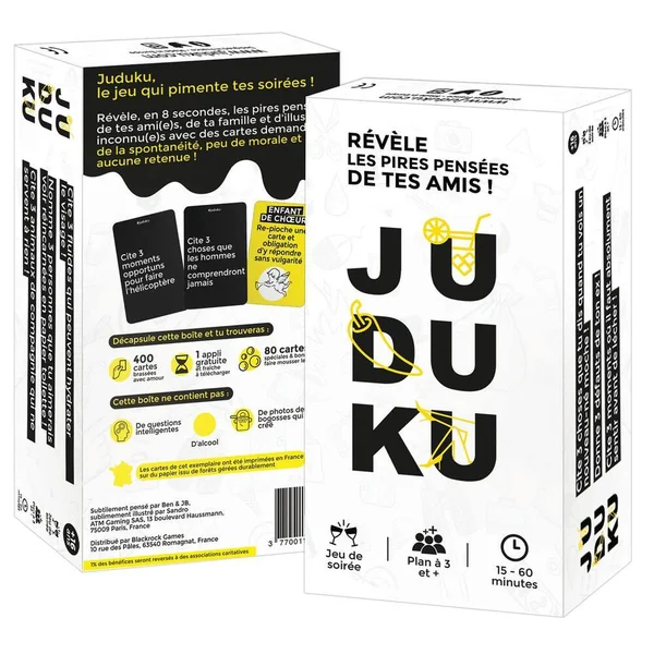 Juduku, le jeu qui pimente tes soirées !Révèle, en 8 secondes, les pires pensées de tes ami(e)s de ta famille et d’illustres inconnu(e)s avec des cartes demandant de la spontanéité, peu de morale et aucune retenue ! Nombre de joueurs : de 3 à 12. Durée d’une partie : de 15 à 60 minutes.