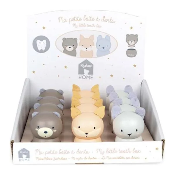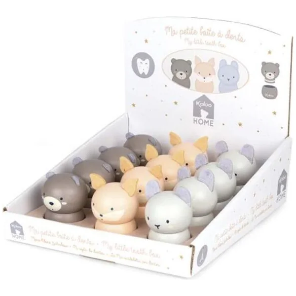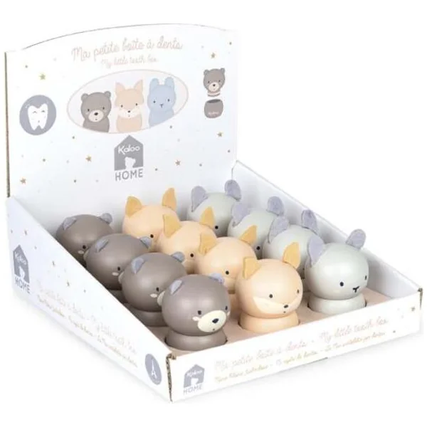 Jolies boîtes en bois pour les dents de lait, disponibles en 3 personnages (lapin, ours et renard) dans de douces couleurs pastel. Système d’ouverture/fermeture simple fabriqué avec un anneau en silicone.