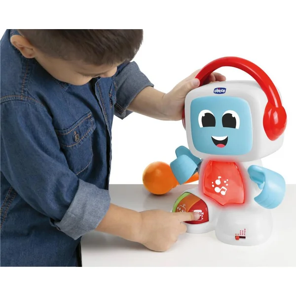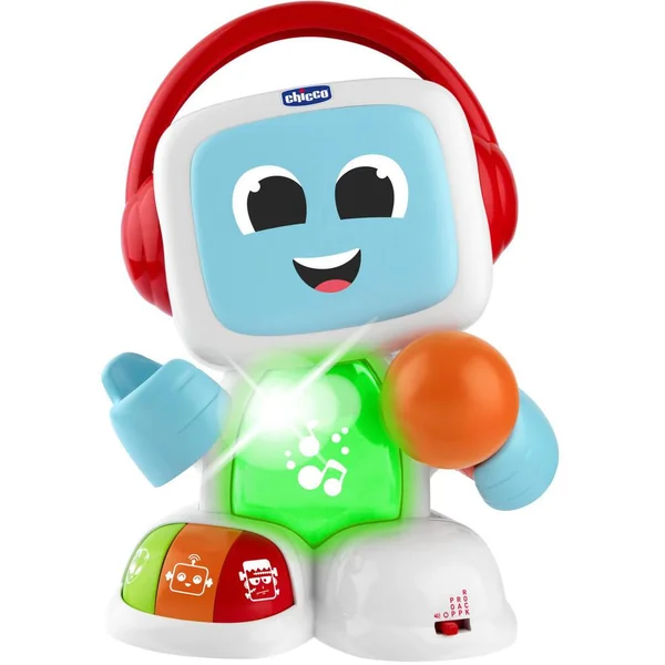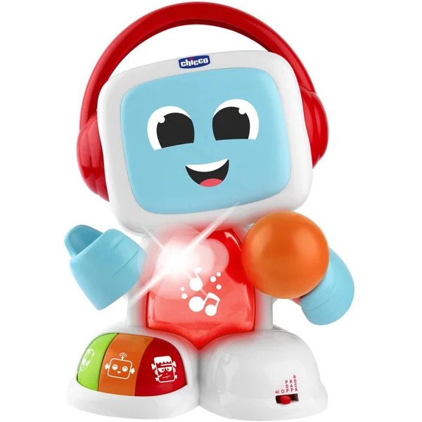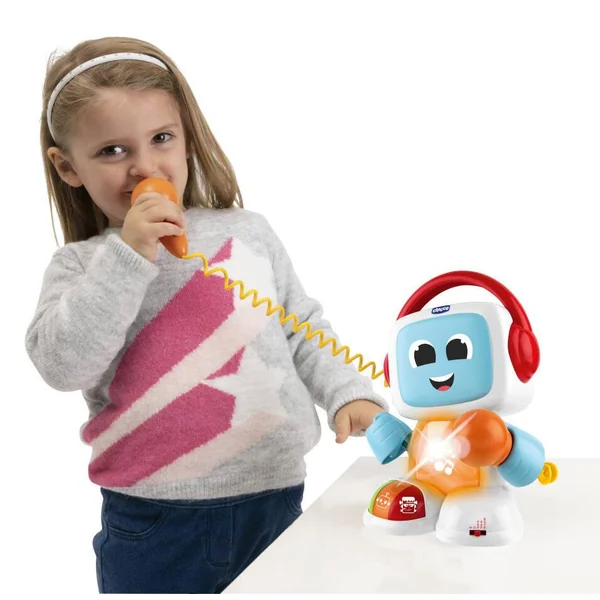 Un karaoké amusant avec un vrai micro pour chanter avec les pistes d’accompagnement et des flashs led colorés. Les tout-petits peuvent activer 3 voix différentes (alien, monstre et robot) et chanter sur 3 modes musicaux. Robit parle en francais pour inciter les enfants à chanter avec lui.