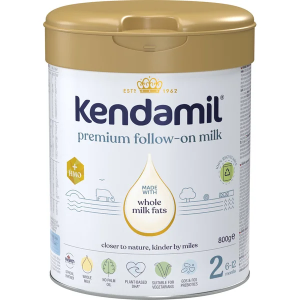 Une nouvelle formule améliorée avec l’oligosaccharide du lait maternel HMO (3´GL) et des prébiotiques (GOS et FOS) a été développée sur la base de 60 ans de recherche et développement. Le lait infantile Kendamil Premium est inspiré du meilleur de la nature. Sa base est principalement du lait de vache entier avec une teneur naturelle en matière grasse laitière, à l’image du lait maternel. Destiné aux bébés de 6 mois à un an. L’emballage est entièrement recyclable.