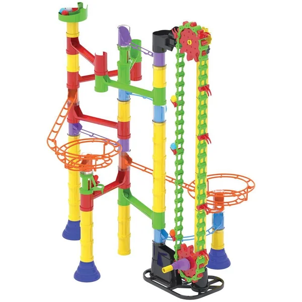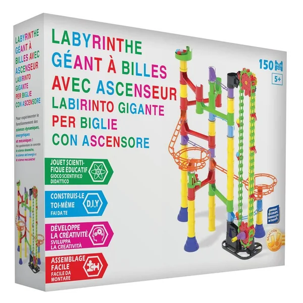 150 pièces au total, dont 12 billes. Reproduit le circuit illustré sur la boîte ou crée une nouvelle course. Les différents éléments s’emboîtent facilement et permettent de construire des combinaisons infinies. Jouet scientifique. Pour expérimenter le fonctionnement des sciences dynamiques, énergétiques et mécaniques ! Avec un lanceur à billes, un ascenseur et un tourniquet. L’ascenseur fonctionne manuellement. Construis-le toi-même (D.I.Y.). Assemblage facile. Développe la créativité. Un petit manuel est fourni avec des informations de montage et 2 exemples de circuit sont proposés, mais les possibilités sont infinies pour l’enfant et son imagination. Fabriqué en Europe.
