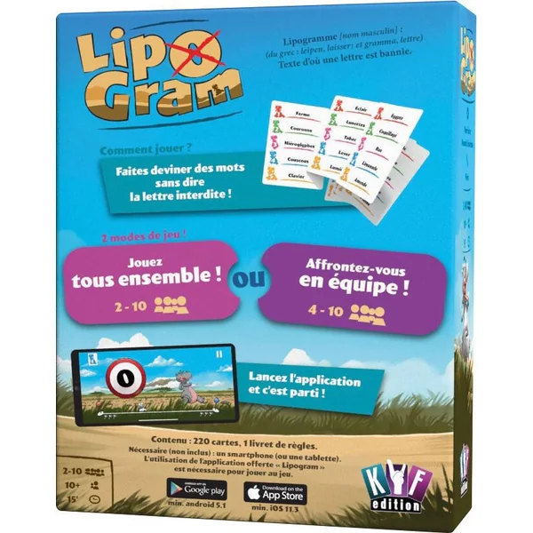 Lipogram, c’est l’expérience la plus fun entre amis et en famille. Faites deviner un mot aux autres, en évitant de prononcer une certaine lettre interdite. Durée de la partie 30 minutes. Nombre de joueurs 2 à 10.