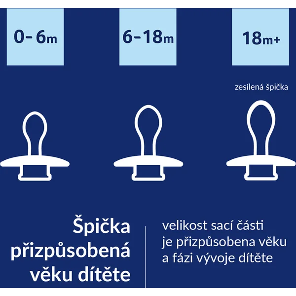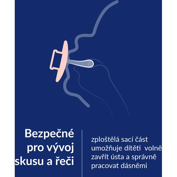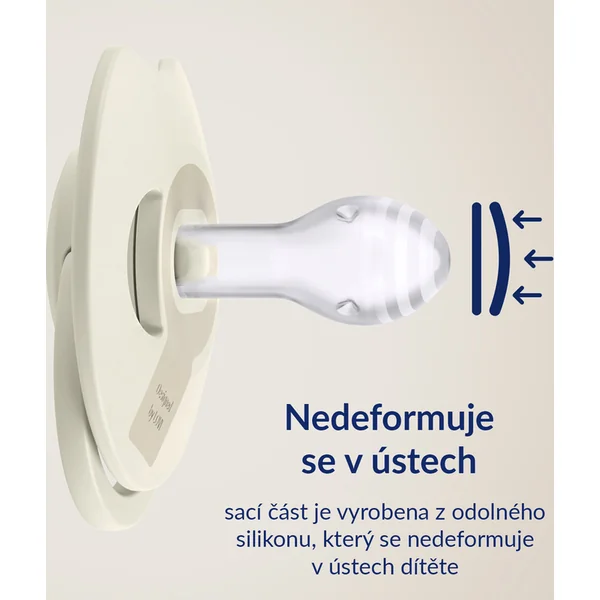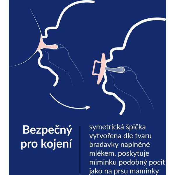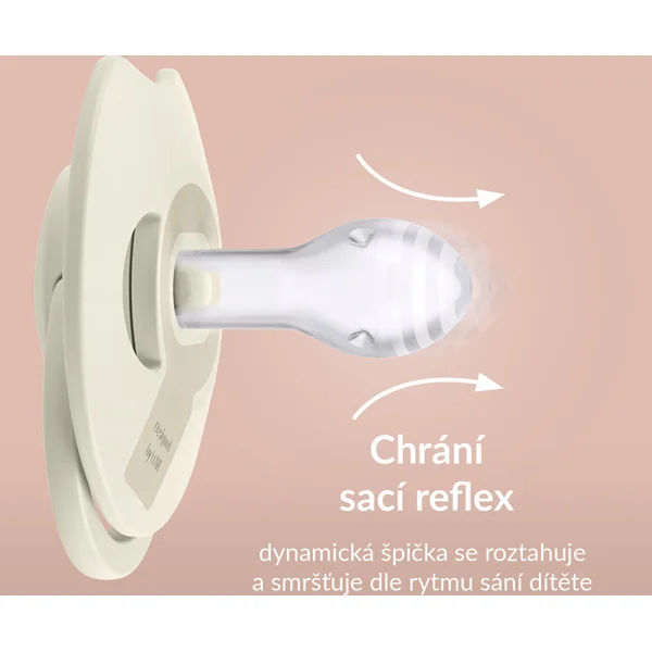 – La tétine dynamique s’étire et se rétracte grâce à une construction unique en silicone de différentes épaisseurs, selon le rythme de succion de l’enfant. Cela protège son réflexe de succion et n’a pas d’effet néfaste sur l’allaitement. La forme symétrique de la pointe s’inspire de la forme du mamelon rempli de lait, offrant à bébé une sensation familière similaire à celle du sein.
