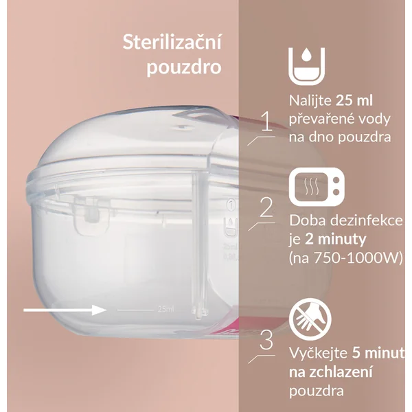 UTILISATION 1. Avant la première et chaque utilisation ultérieure, lavez l’étui à l’eau chaude avec un détergent doux, puis rincez soigneusement. 2. Versez 25 ml d’eau bouillie au fond. IMPORTANT Ajouter trop peu d’eau peut endommager l’étui. Ajouter trop d’eau peut entraîner une désinfection inappropriée. 3. Placez les tétines dans l’étui. 4. Mettez le couvercle et fermez-le hermétiquement. 5. Placez l’étui fermé dans le micro-ondes. 6. Pour les micro-ondes de 750-1000 W, le temps de désinfection est de 2 minutes. Ne dépassez pas le temps de désinfection.