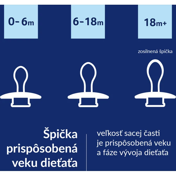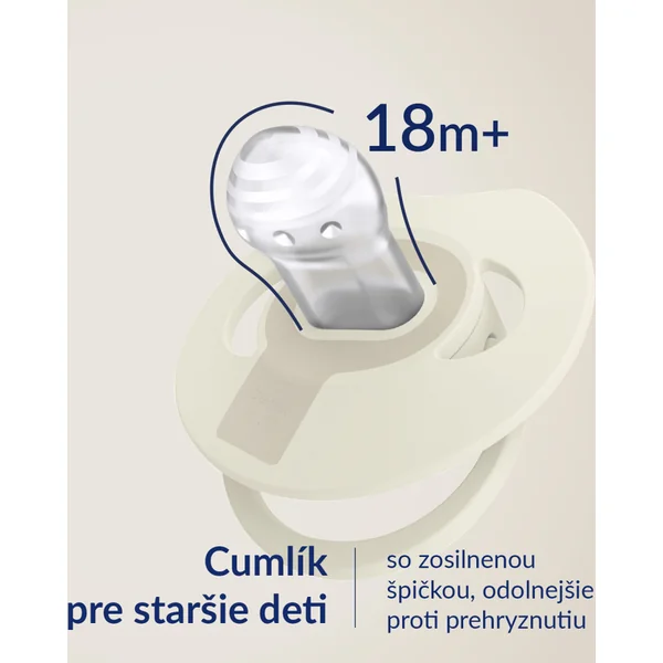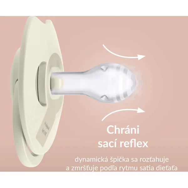 La forme symétrique de la pointe est inspirée de la forme d’un mamelon rempli de lait, offrant au bébé une sensation familière similaire à celle du sein. Le bouclier de la tétine est spécialement conçu pour faciliter la respiration par le nez et la déglutition de la salive, tout comme avec les seins. Le bouclier moulé adhère le moins possible à la peau de l’enfant, ce qui facilite la libre circulation de l’air et réduit ainsi le risque d’irritation de la peau.
