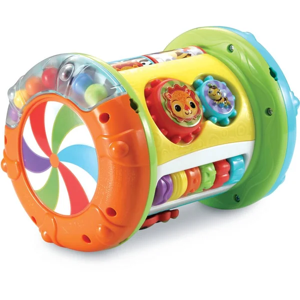 – Manipulations : les différentes faces du rouleau possèdent des activités qui permettent de développer la motricité de l’enfant : 3 touches de piano lumineuses pour découvrir les chiffres, les couleurs et les animaux; 2 roulettes et 6 perles colorées à faire tourner; 2 engrenages à manipuler et