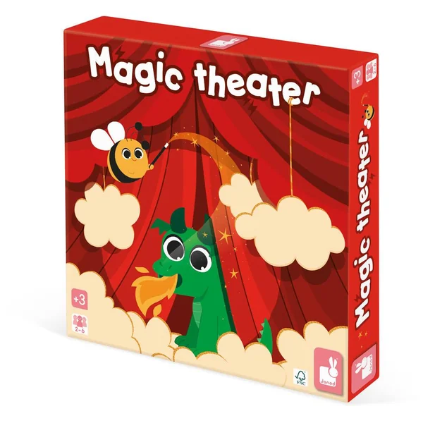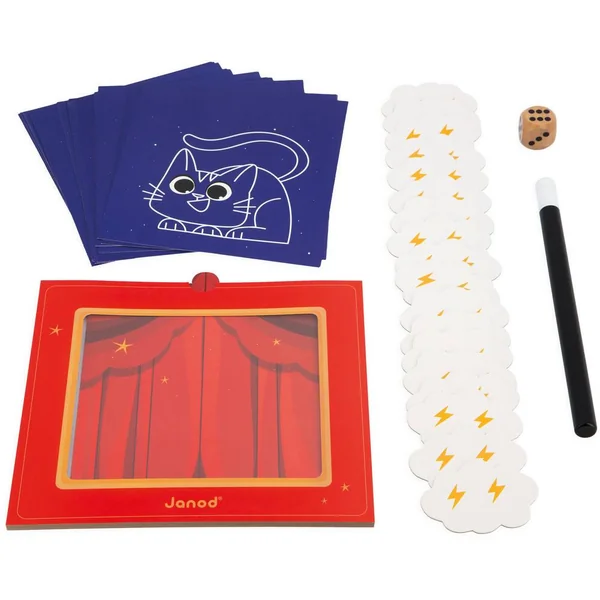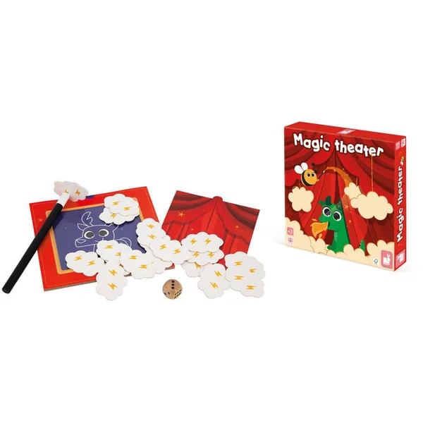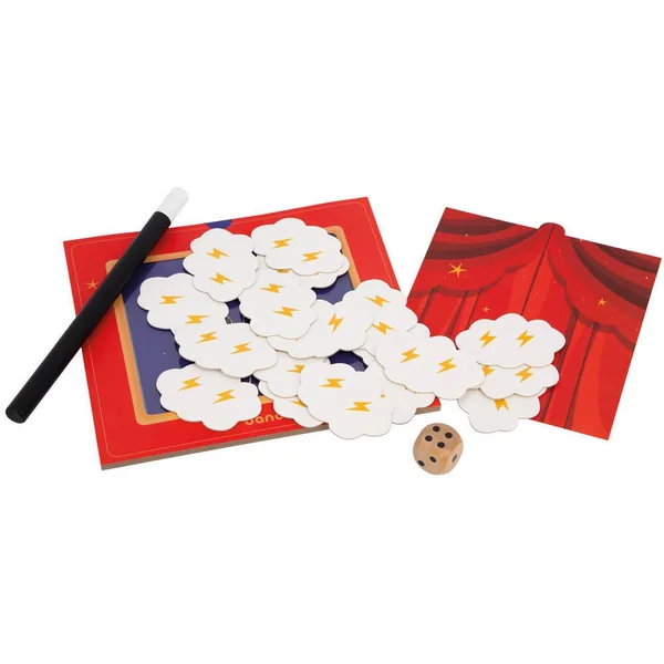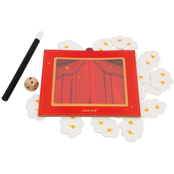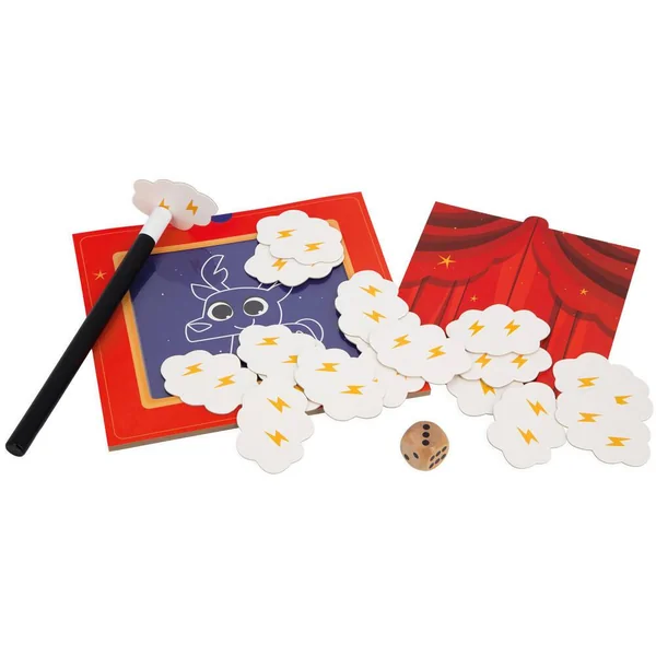 Jeu de stratégie Une brume envahie le théâtre… Magicien ! Magicienne ! Sauras-tu trouver les illustrations qui se cachent derrière les nuages ? Pour cela, chacun son tour, les magiciens utiliseront la baguette magique pour enlever les nuages et découvrir un peu plus l’illustration qui se cache en dessous. Mais attention, les nuages ne sont magnétiques que sur une petite surface… il faudra être habile et attentif pour être celui qui en retirera le plus et qui devinera l’illustration le premier. Jeu en carton et en bois FSC™. Pour les enfants à partir de 3 ans. 2 joueurs et plus.