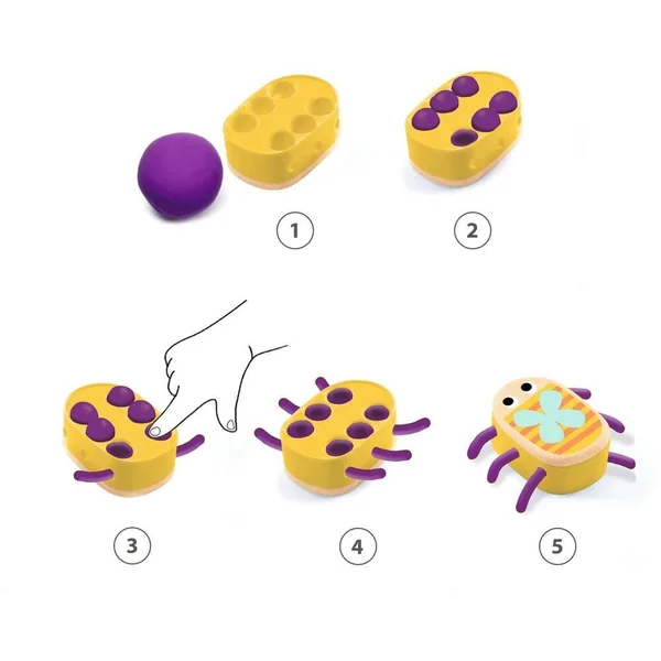 Une activité de pâte à modeler inédite et très facile pour les enfants, dès 18 mois. L’enfant remplit de pâte les trous et y enfonce ses doigts. La pâte sort sur les côtés. Il les retourne alors et découvre de jolis animaux, avec des pattes ! Une fois terminé, il retire la pâte des trous et il peut recommencer autant de fois qu’il le souhaite.